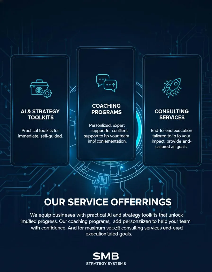 We equip businesses with practical AI and strategy toolkits that unlock immediate, self-guided progress. Our coaching programs add personalized, expert support to help your team implement with confidence. And for maximum speed and impact, our consulting services provide end-to-end execution tailored to your goals.